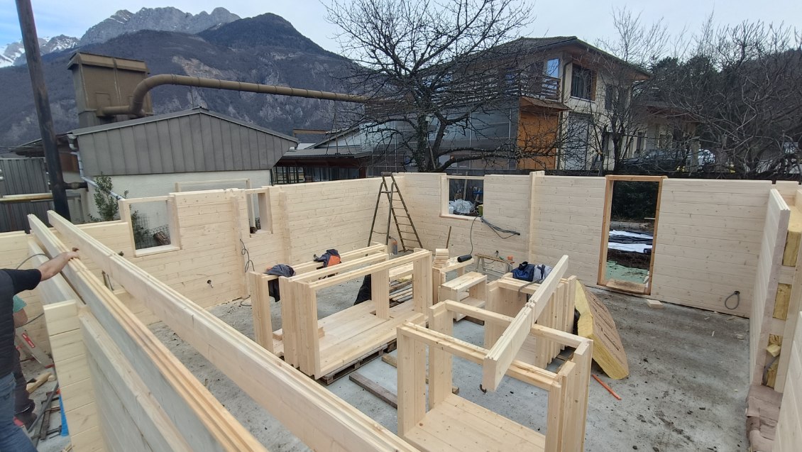 Une isolation est ensuite placée dans la réservation créée par les madriers. Celle-ci peut aller de 80mm à 200mm selon les régions et les besoins de la construction souhaitée.